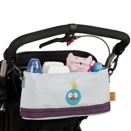 Elle s’accroche à la poussette à l’aide de mousquetons et d’une fermeture par bande auto grippante. Son design amusant est aussi un de ses atouts.