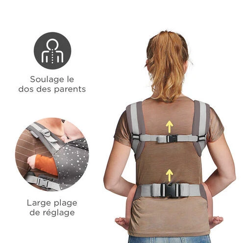 – Il vous permet de porter votre bébé dans une position ergonomique sur le ventre et dans une position sûre pour les bébés qui savent s’asseoir sur le dos des parents
