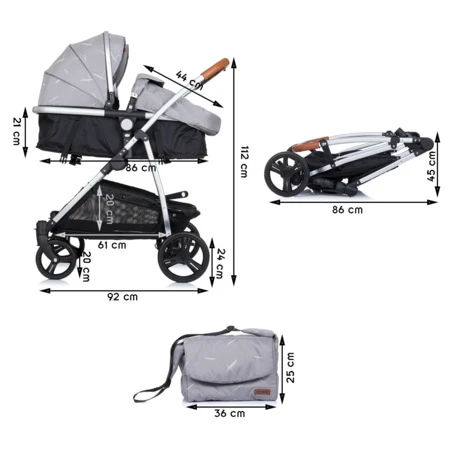 La poussette mesure L 92 cm x largeur poussette 79 cm x H 112 cm, la nacelle mesure L 86 cm x l 34 cm x H 21 cm et le cosy mesure L 68 cm x l 46 cm x H 60 cm. Le poids d’un cosy est de 2,7 kg, le poids du cadre est de 8,70 kg et le poids d’une nacelle est de 3 kg.